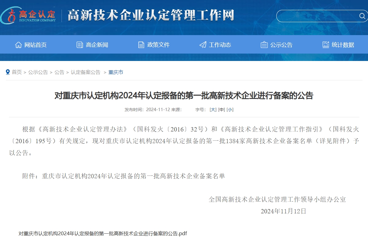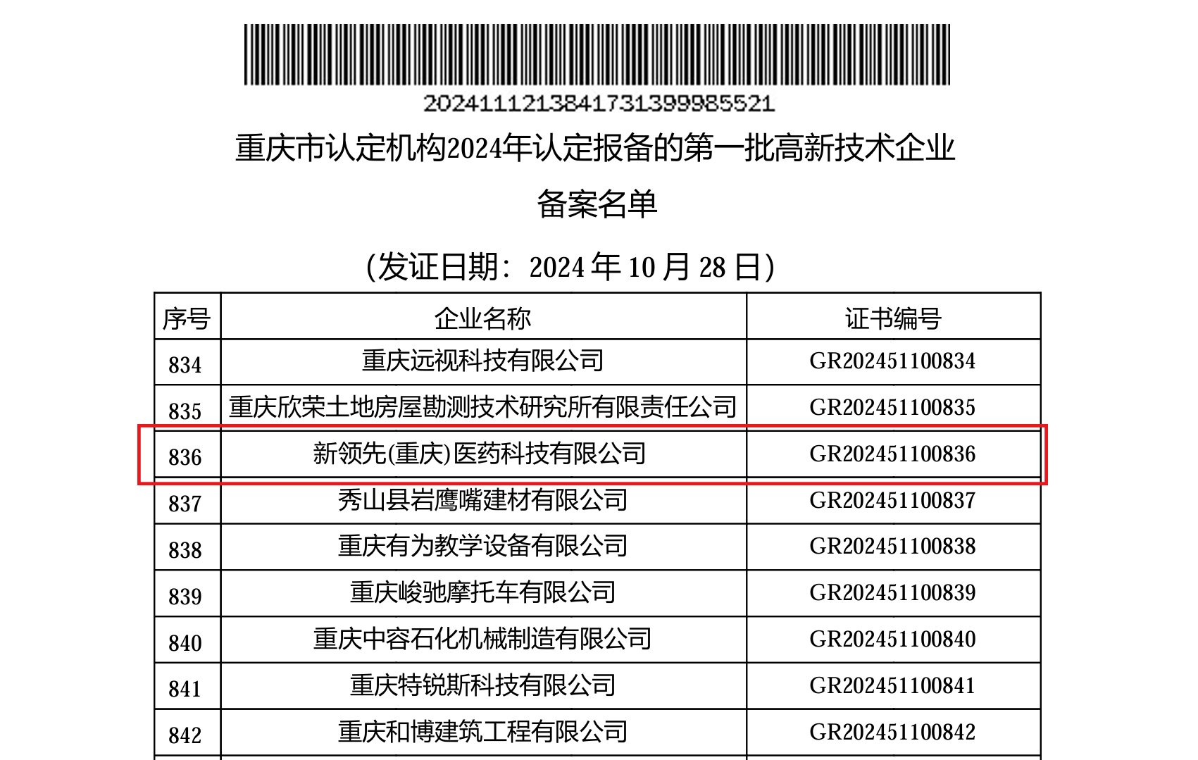 近日,国家高新企业技术认定管理工作网发布《对重庆市认定机构2024年认定报备的第一批高新技术企业进行备案的公告》,新领先(重庆)医药科技成功通过国家“高新技术企业”认定!