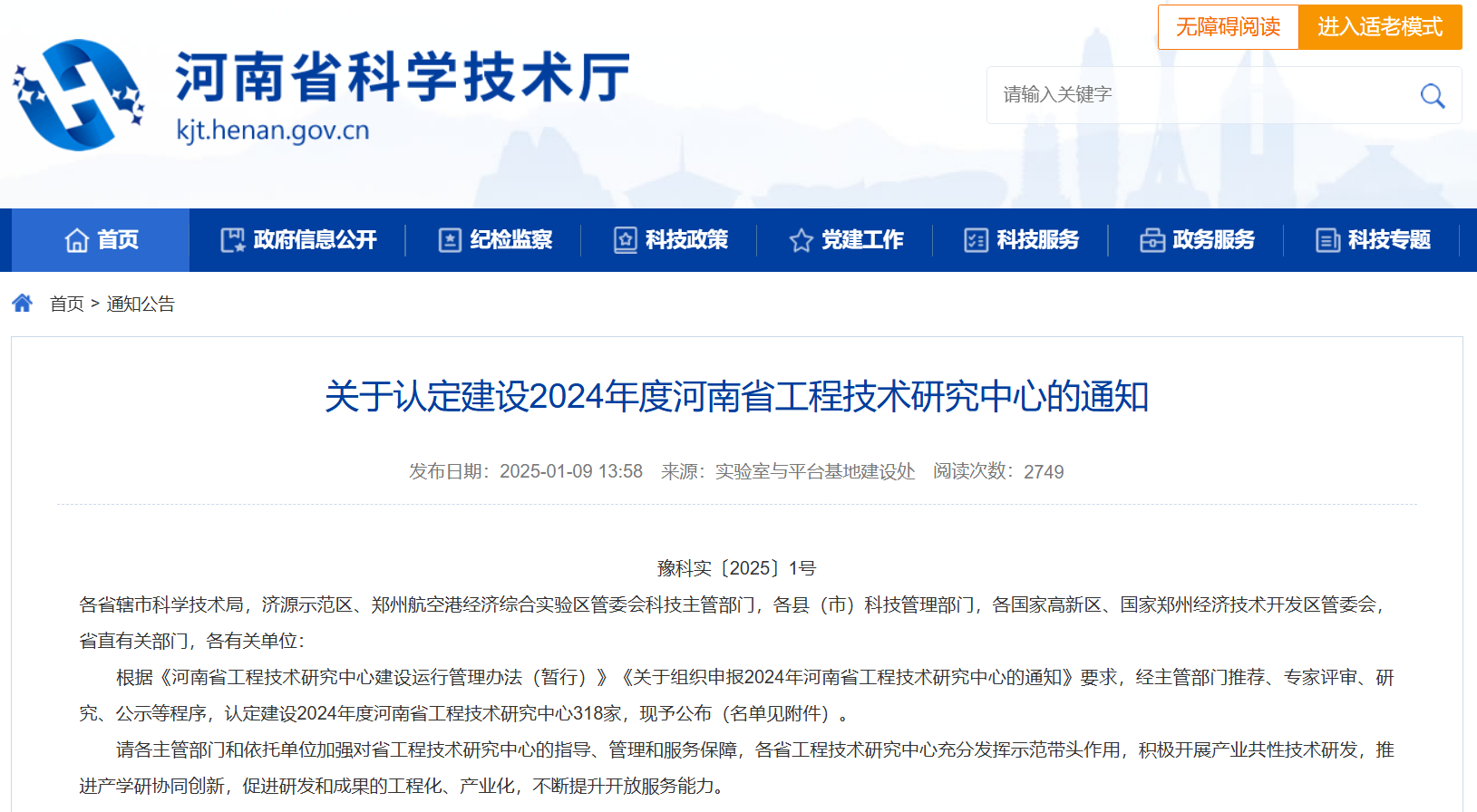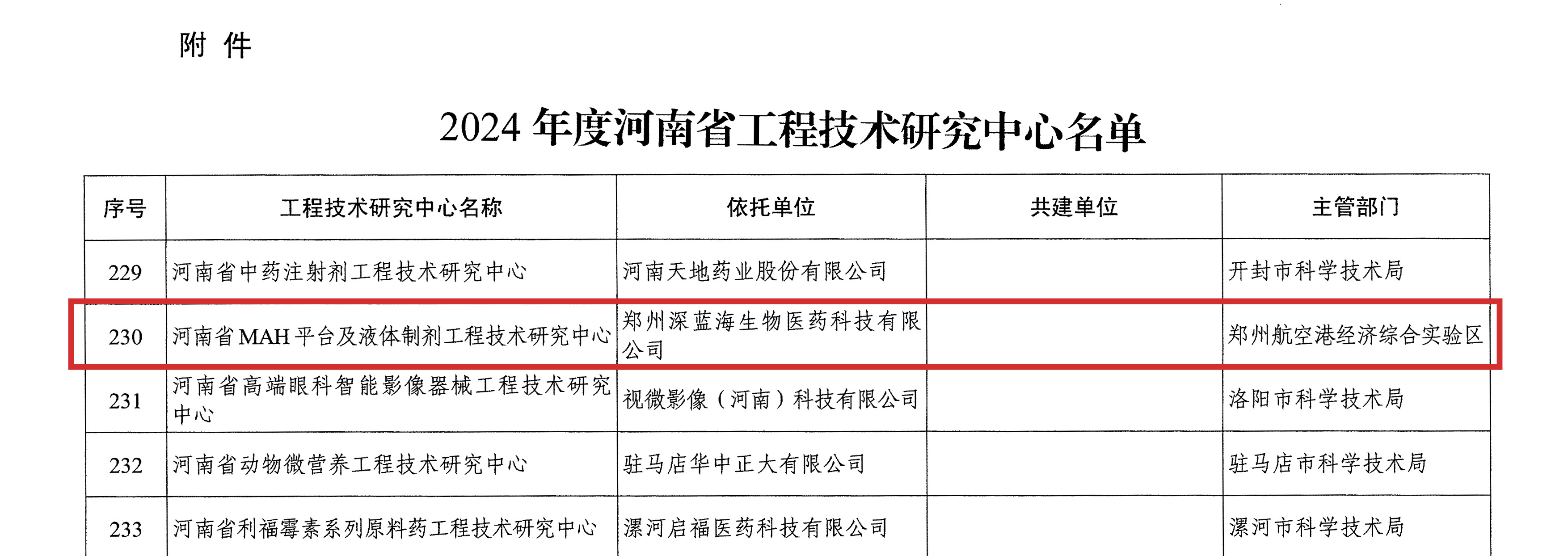 近日,河南省科学技术厅公布了2024年度河南省工程技术研究中心名单。新领先·深蓝海(郑州)申报的“河南省mah平台及液体制剂工程技术研究中心”成功获批,这是公司继“高新技术企业”“河南省专精特新中小企业”等荣誉后获得的又一项省级以上荣誉。