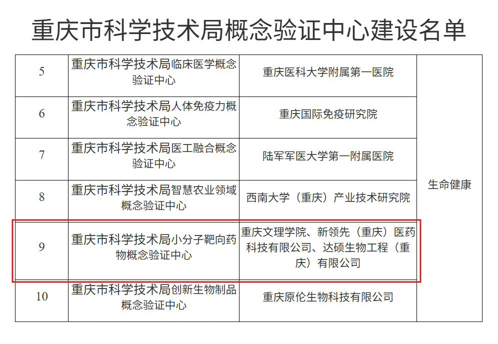 近日,重庆市科学技术局凯发官方首页官网发布《关于公布重庆市科学技术局概念验证中心建设名单的通知》,新领先(重庆)医药科技成功入选“重庆市科学技术局小分子靶向药物概念验证中心”依托单位。