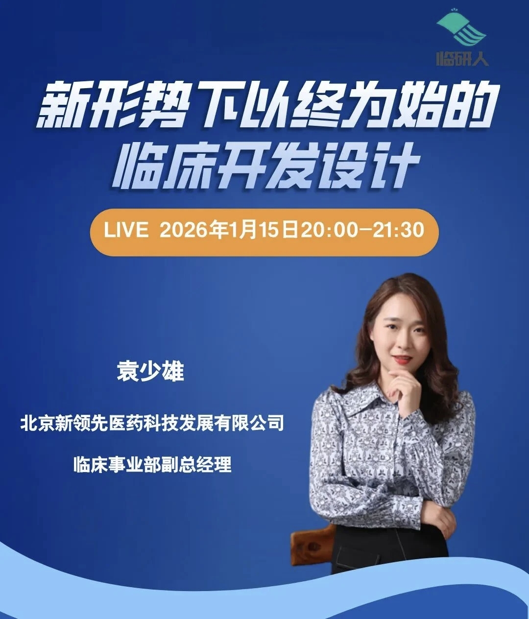 近日,北京新领先医药科技发展有限公司临床事业部副总经理兼医学商务总监袁少雄女士受“临研人”平台邀请,以“新形势下以终为始的临床开发设计”为主题开展演讲直播。