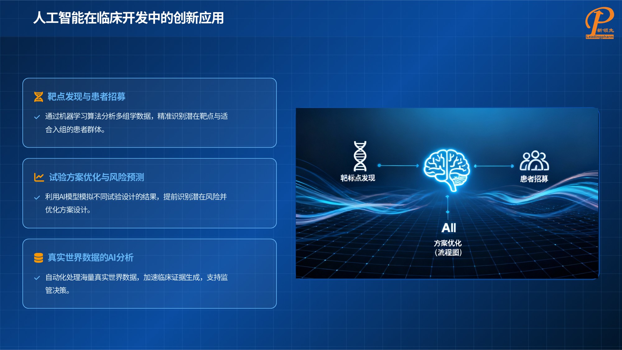 人工智能正为临床开发带来全方位创新变革。数据管理层面,ai 通过 nlp 技术实现非结构化数据转化,自动化完成数据清洗、质量控制与分析,合成数据技术突破隐私限制;试验执行阶段,ai 可辅助优化试验方案、智能匹配招募患者、通过聊天机器人与可穿戴设备提升患者依从性,还能优化研究中心资源分配等。