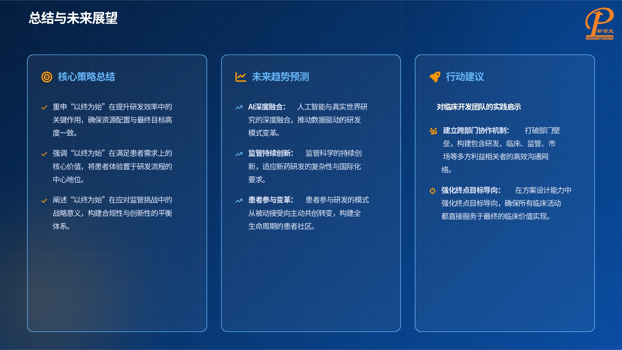 总结而言,以终为始的策略贯穿临床开发全流程,在提升研发效率、聚焦患者需求、应对监管挑战中发挥核心作用。未来,ai 与真实世界研究的深度融合将推动数据驱动研发模式变革,监管科学将持续创新以适配新药研发的复杂性与国际化需求,患者参与模式也将从被动接受转向主动共创。行业需构建全生命周期的 “终始闭环”,强化跨部门协作与终点目标导向,在保障合规性的同时持续创新,实现临床价值与市场价值的最大化。