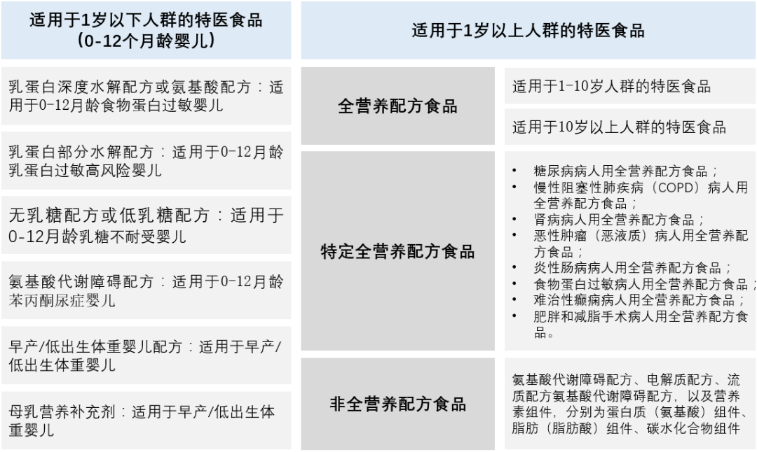 特殊医学用途配方食品分为供1岁以下婴儿食用的特殊医学用途婴儿配方食品和供1岁以上人群食用的特殊医学用途配方食品。适用于1岁以上人群的特医食品又分为全营养配方食品、特定全营养配方食品和非全营养配方食品。