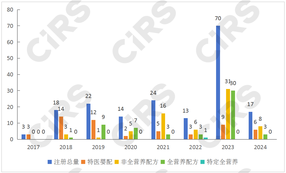自2017年第一款特医婴配产品注册成功后,特医食品注册大门正式打开。下图可知,特医婴配呈现高开低走的趋势,其注册主要集中于2018年和2019年,非全营养配方的注册则集中于2021和2023年。2022年总注册量较少,但注册产品类型增多,且新增了首款特定全营养配方食品。2023年新增了首款增稠组件,注册类型主要集中于全营养和非全营养产品,其占比高达87%。相比2022年注册量,2023年呈现爆发式增长。2024年第一季度已新增17款产品,由此可见2024年的产品获批势头强劲,而特定全营养食品依然是需要继续突破的大关。
