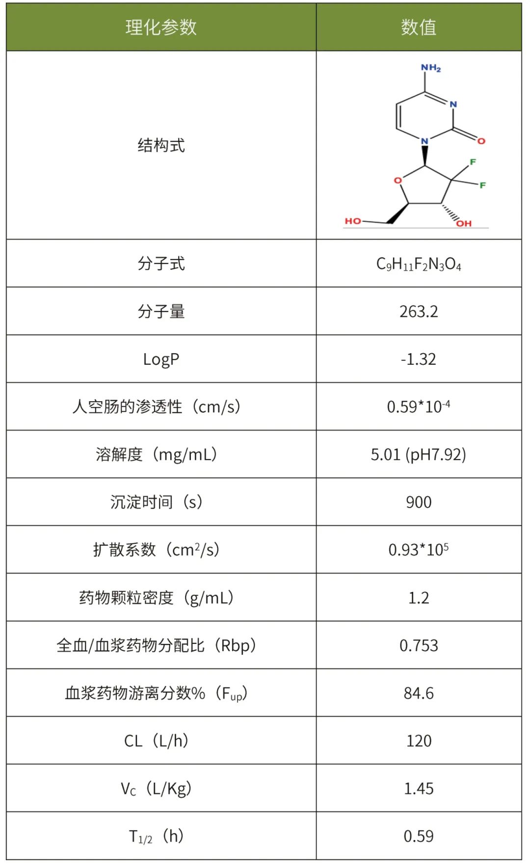 所有模型的剂量体积均设置为250ml。所有的模拟均使用一房室分布模型、空腹状态的acat模型,采用gastroplus软件预测吉西他滨的主要adme参数见表1。