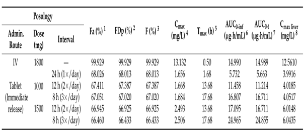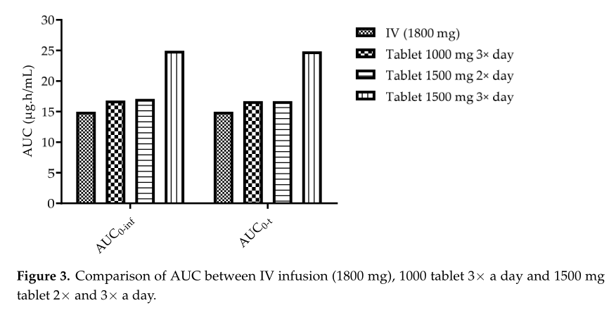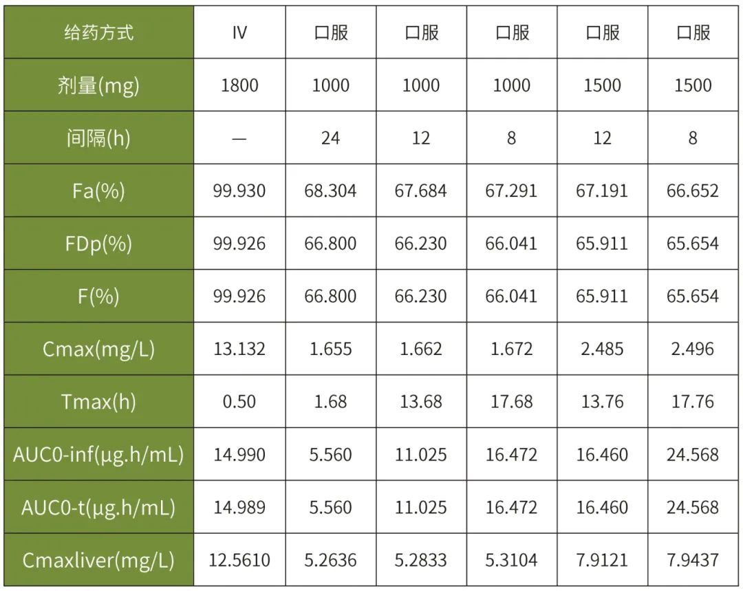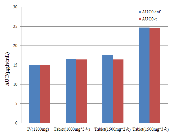 所有口服给药的研究方案中所预测的cmax均低于静脉推注的结果(模拟最大的cmax为2.496mg/l,为每日三次给药1500mg片剂后预测值)。