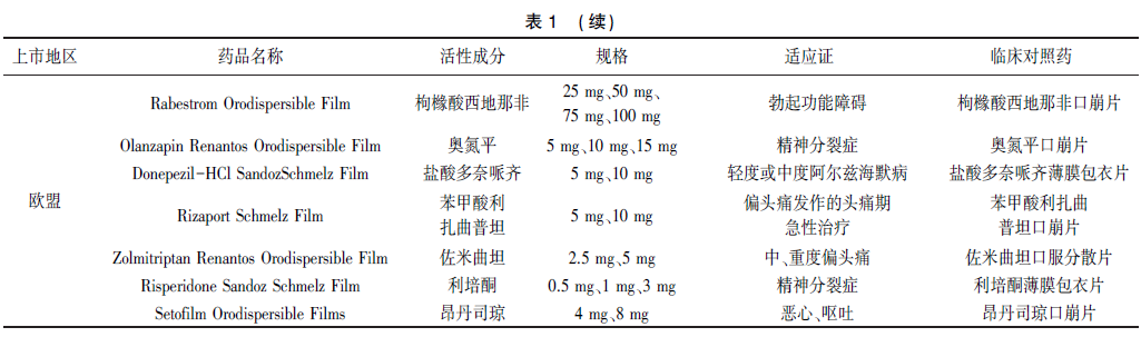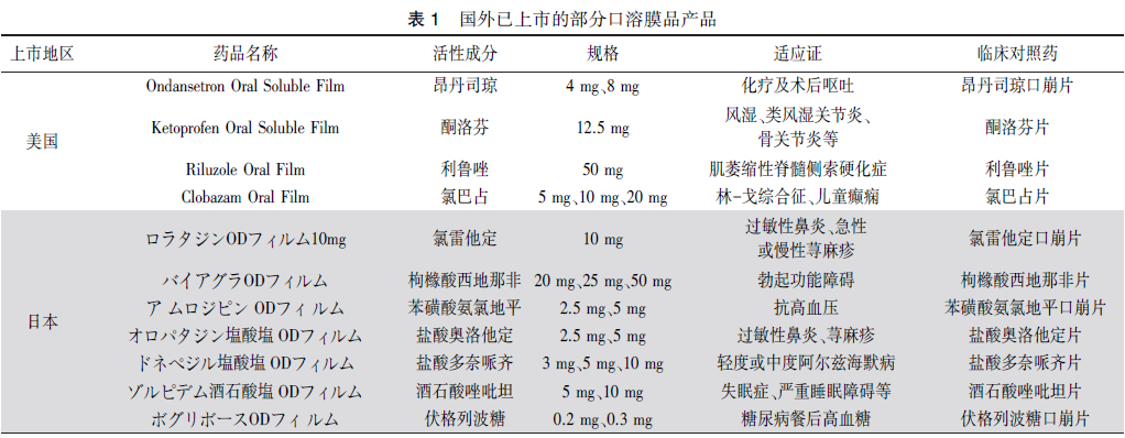 2006年,日本上市了第一个口溶膜处方药伏格列波糖口溶膜。2010年,美国和欧洲分别上市第一个口溶膜处方药昂丹司琼口溶膜(rapidfilm和setofilm)。2020年,国家药品监督管理局批准了第一个口溶膜化学药品奥氮平口溶膜上市。目前,全球已有多个口溶膜产品上市,查询美国、欧洲、日本药品监管机构网站,部分品种信息见表1。
