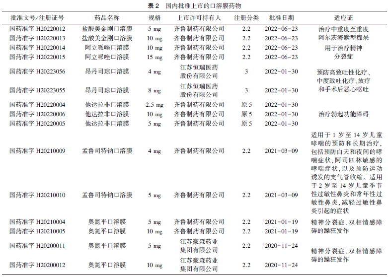 通过国家药品监督管理局网站查询,统计了我国批准的口溶膜药物(见表2),共15个批准文号,按照注册分类统计,其中10个为2.2类改良型新药,占大多数;按适应证统计,其中6个为精神障碍疾病药物、3个为生殖系统疾病药物、2个为精神神经系统药物、2个为呼吸系统疾病及抗过敏药物、2个消化道及代谢药物。