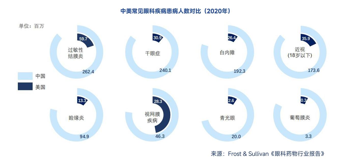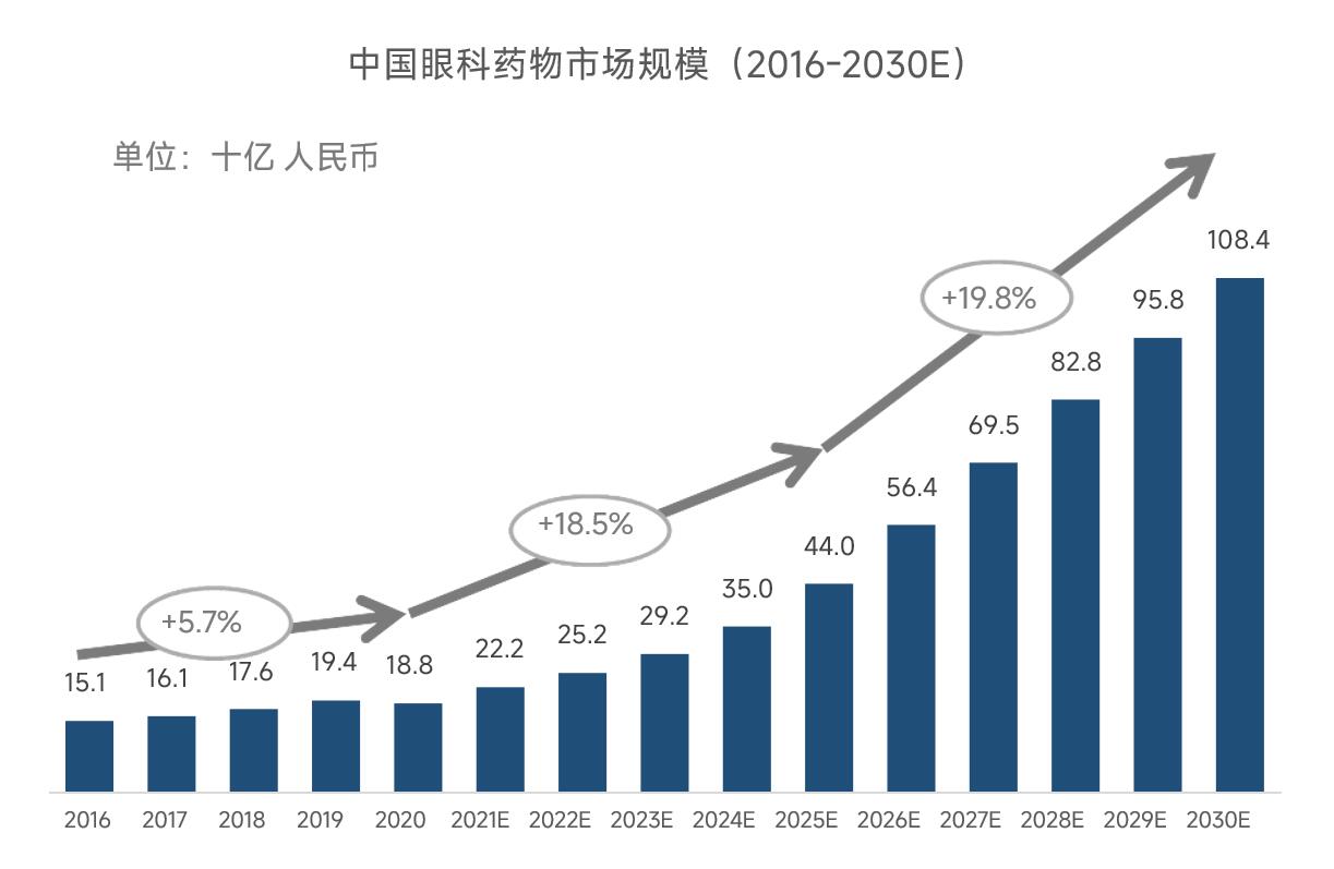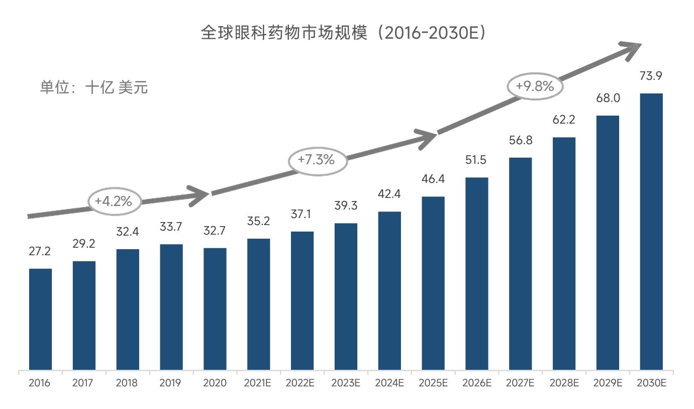 目前,全球眼科市场整体呈现出稳定增长、集中度较高的特点。2016年至2020 年,全球眼科药物市场规模从277亿美元增长至327亿美元,复合年增长率为 4.2%。随着未来更多眼科创新药物的研发和上市,预计2025年将达到464亿美元,2030年将达到739亿美元。2016-2020年中国眼科药物市场规模从151亿增长至188亿元,复合年增长率达5.7%,预计2025年将达到440亿元,2030年将达到1084亿元。预计未来,中国将以超过全球2倍的平均增长率快速增长,发展势头强劲。