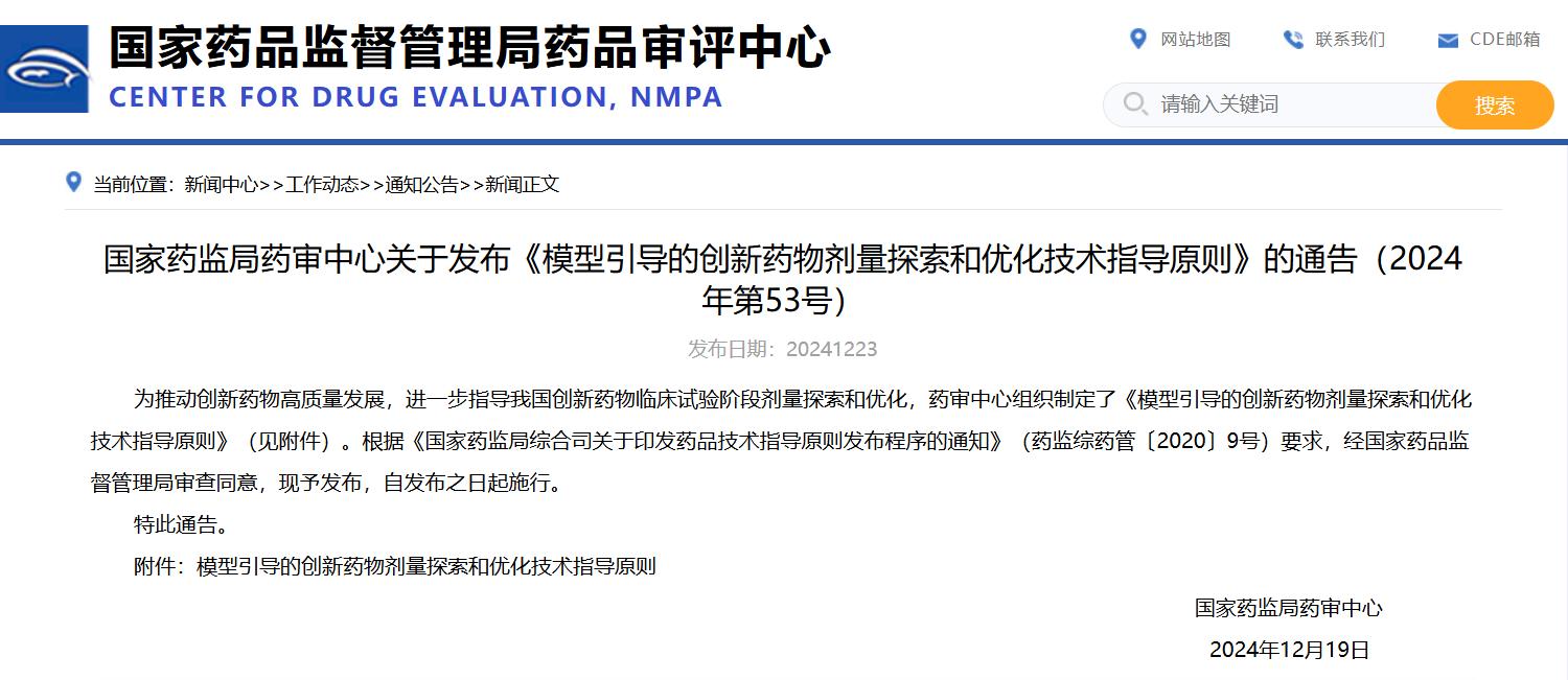 国家药监局药审中心关于发布《模型引导的创新药物剂量探索和优化技术指导原则》的通告(2024年第53号)