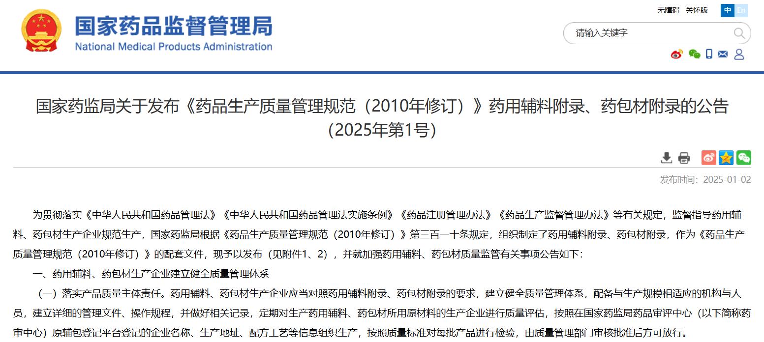 国家药监局关于发布《药品生产质量管理规范(2010年修订)》药用辅料附录、药包材附录的公告(2025年第1号)