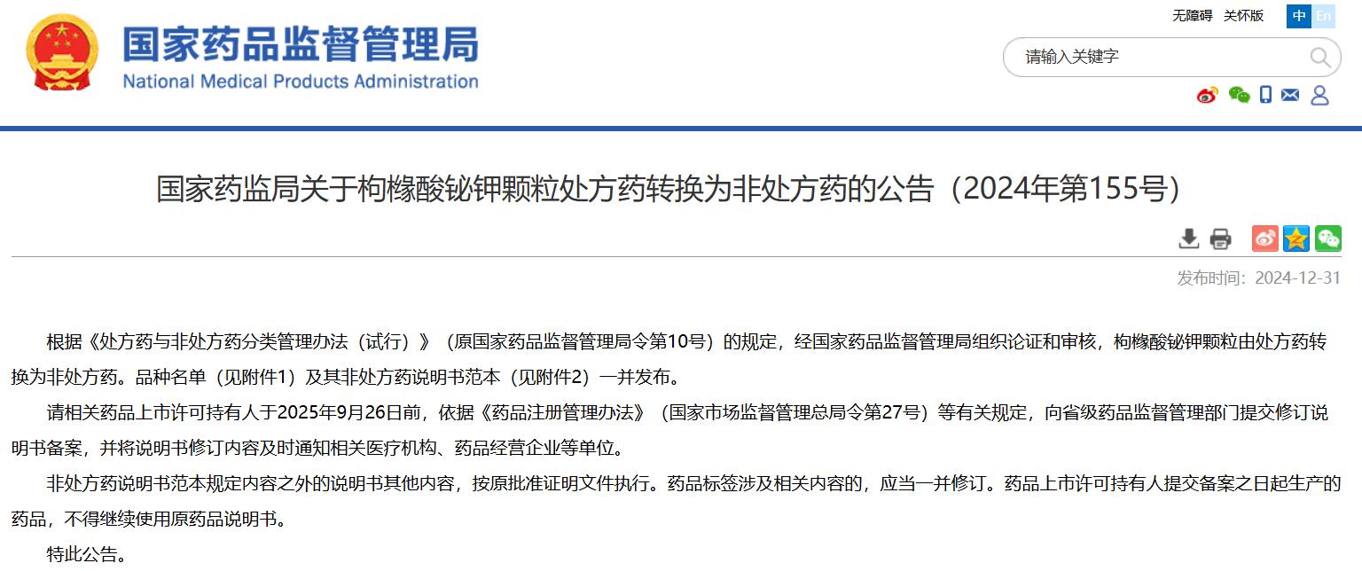 国家药监局关于枸橼酸铋钾颗粒处方药转换为非处方药的公告(2024年第155号)