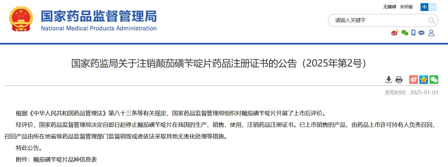 国家药监局关于注销颠茄磺苄啶片药品注册证书的公告(2025年第2号)