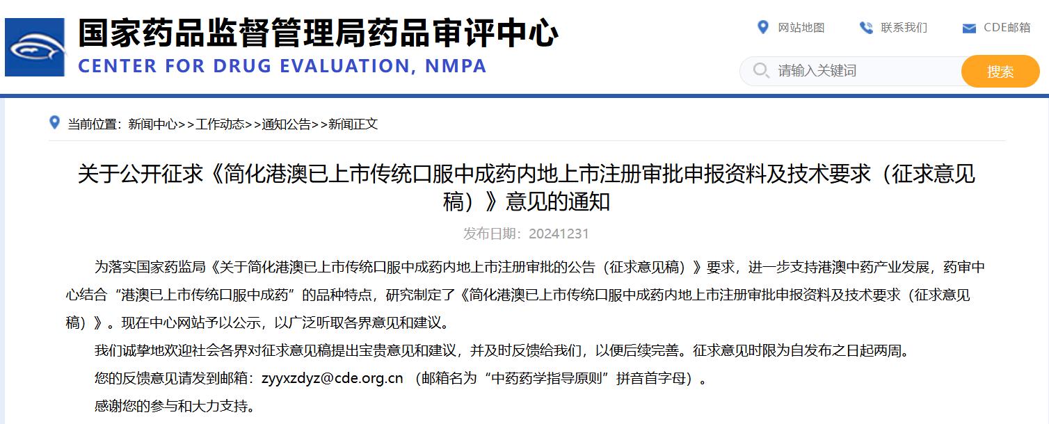 关于公开征求《简化港澳已上市传统口服中成药内地上市注册审批申报资料及技术要求(征求意见稿)》意见的通知