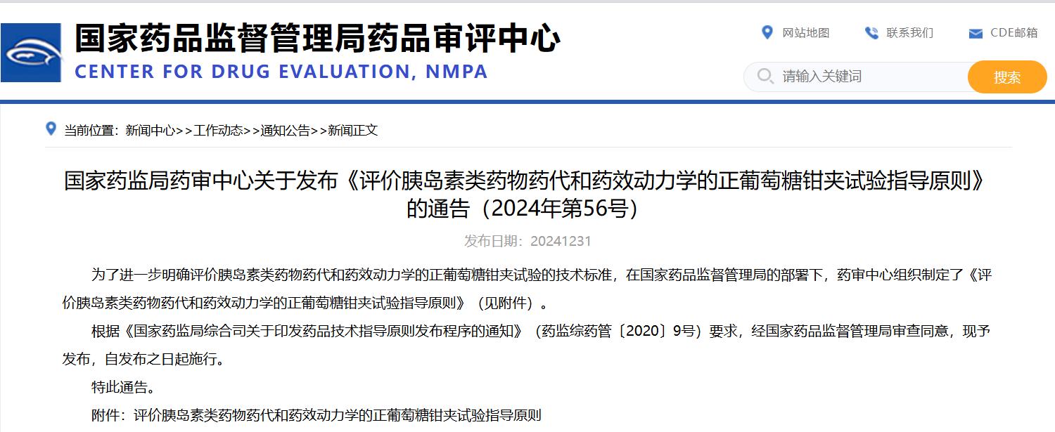 国家药监局药审中心关于发布《评价胰岛素类药物药代和药效动力学的正葡萄糖钳夹试验指导原则》的通告(2024年第56号)