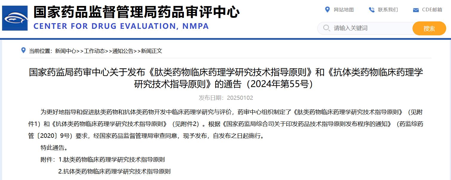 国家药监局药审中心关于发布《肽类药物临床药理学研究技术指导原则》和《抗体类药物临床药理学研究技术指导原则》的通告(2024年第55号)