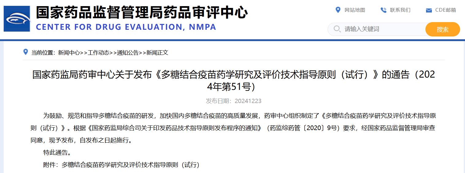 国家药监局药审中心关于发布《多糖结合疫苗药学研究及评价技术指导原则(试行)》的通告(2024年第51号)