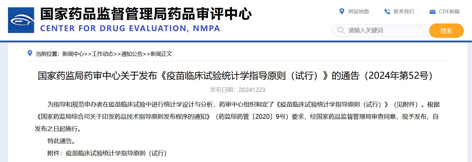国家药监局药审中心关于发布《疫苗临床试验统计学指导原则(试行)》的通告(2024年第52号)
