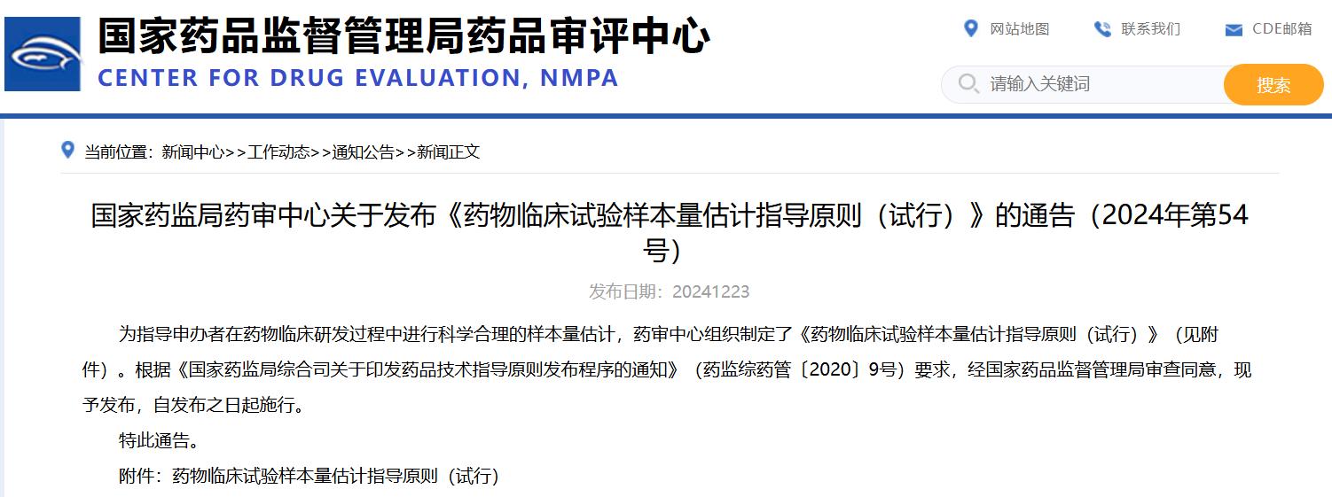 国家药监局药审中心关于发布《药物临床试验样本量估计指导原则(试行)》的通告(2024年第54号)