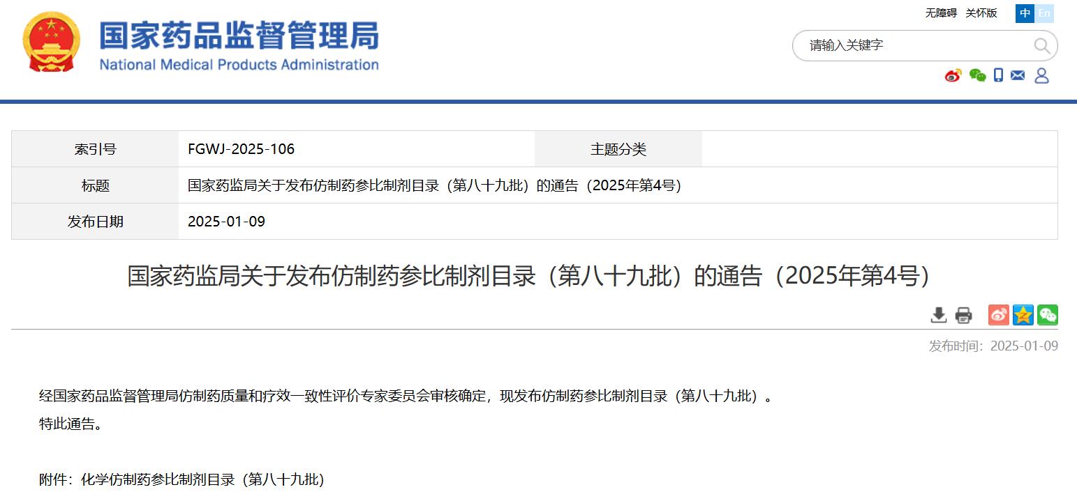 国家药监局关于发布仿制药参比制剂目录(第八十九批)的通告(2025年第4号)