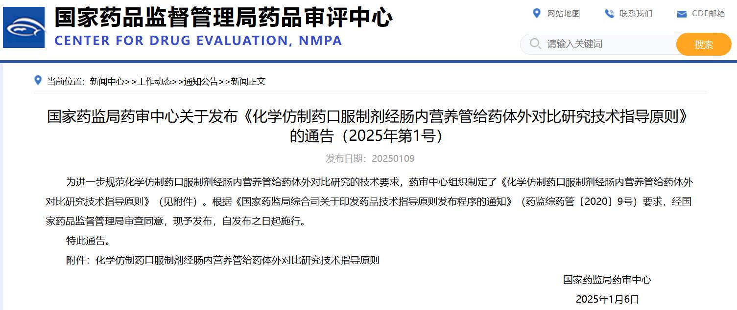 国家药监局药审中心关于发布《化学仿制药口服制剂经肠内营养管给药体外对比研究技术指导原则》的通告(2025年第1号)