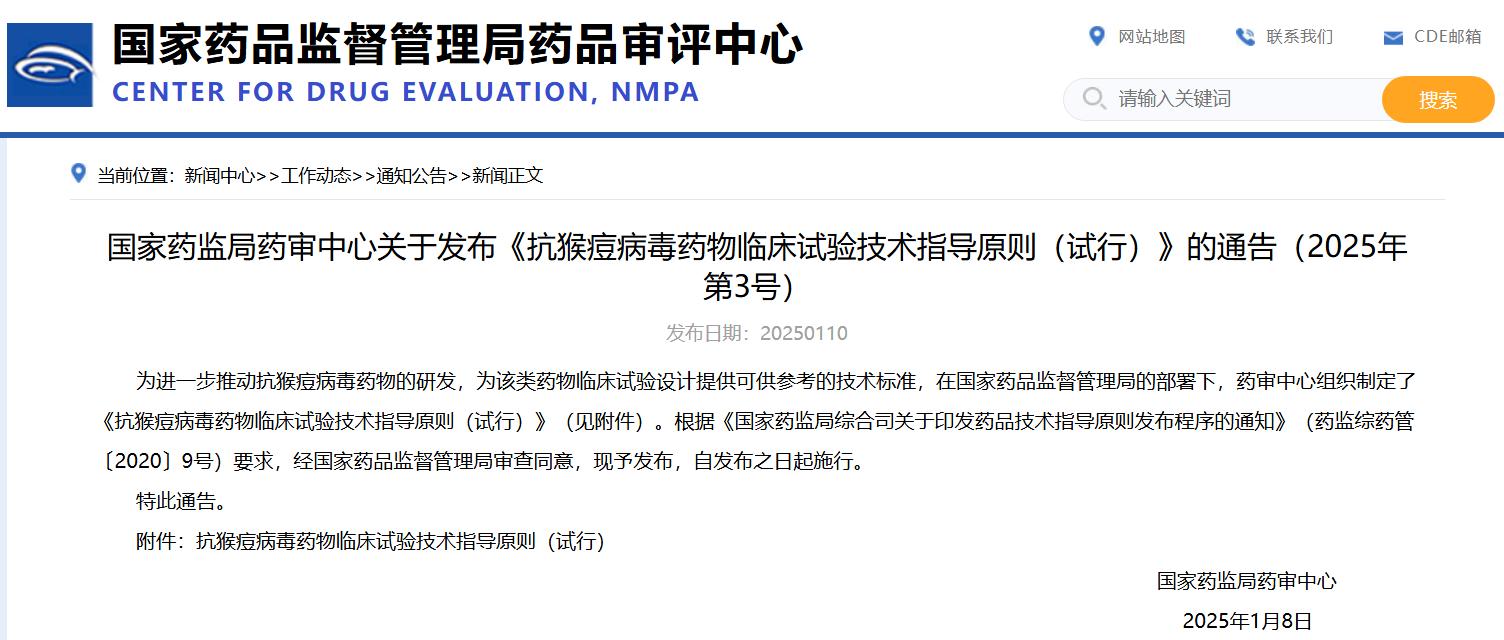 国家药监局药审中心关于发布《抗猴痘病毒药物临床试验技术指导原则(试行)》的通告(2025年第3号)