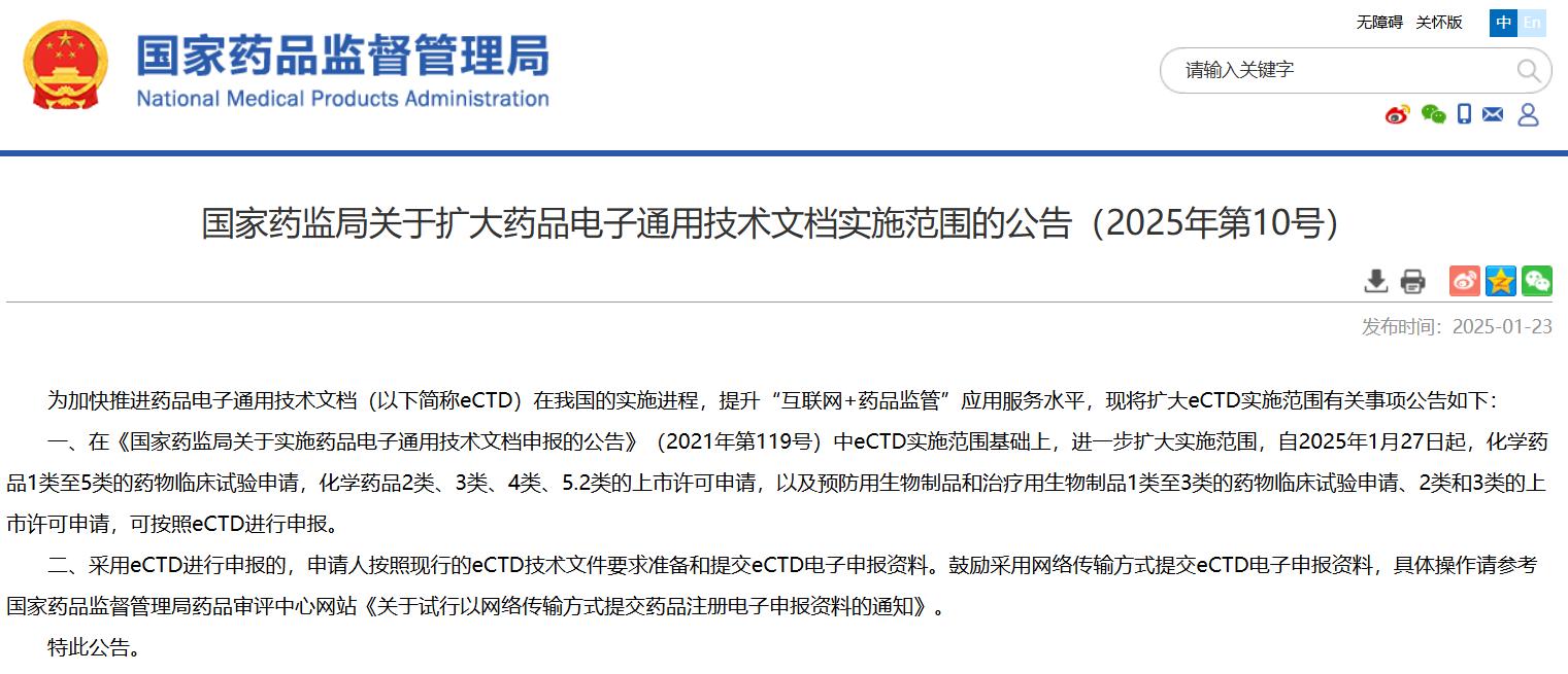 国家药监局关于扩大药品电子通用技术文档实施范围的公告(2025年第10号)