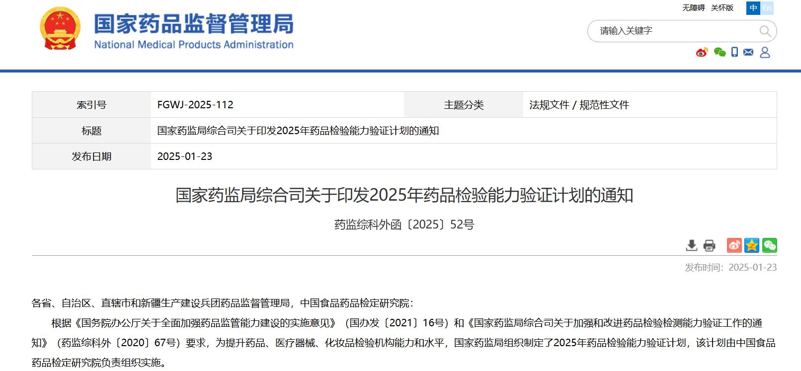 国家药监局综合司关于印发2025年药品检验能力验证计划的通知