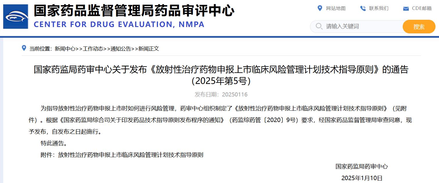 国家药监局药审中心关于发布《放射性治疗药物申报上市临床风险管理计划技术指导原则》的通告(2025年第5号)