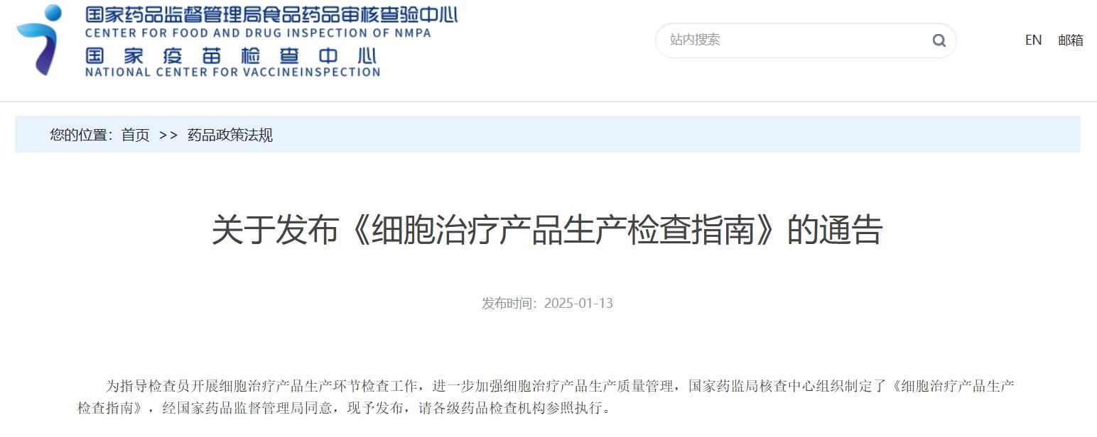国家药监局核查中心关于发布《细胞治疗产品生产检查指南》的通告