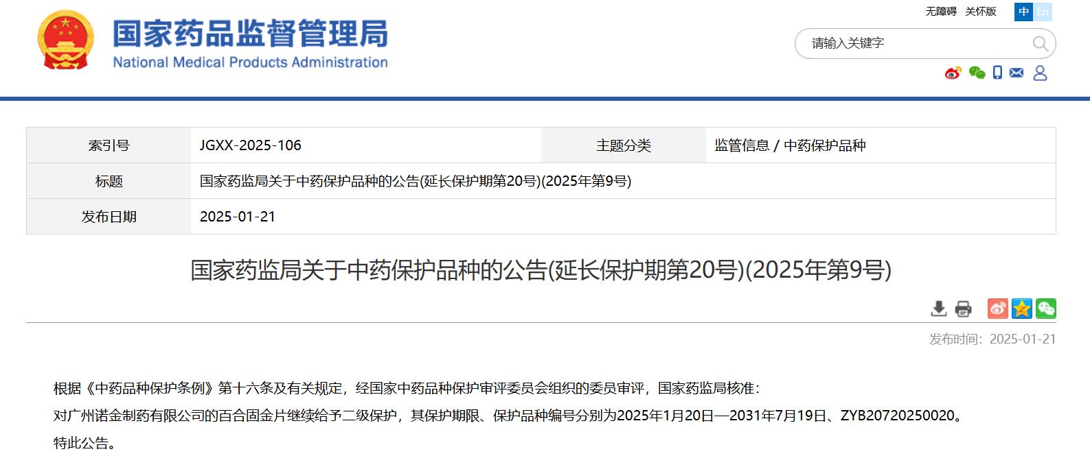 国家药监局关于中药保护品种的公告(延长保护期第20号)(2025年第9号)