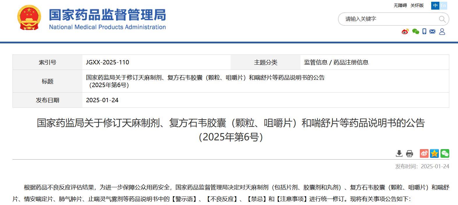 国家药监局关于修订天麻制剂、复方石韦胶囊(颗粒、咀嚼片)和喘舒片等药品说明书的公告(2025年第6号)