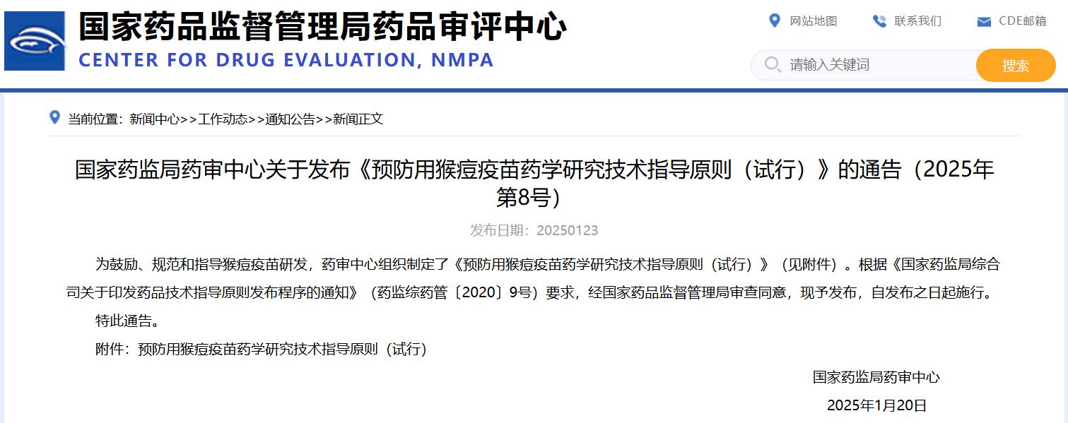 国家药监局药审中心关于发布《预防用猴痘疫苗药学研究技术指导原则(试行)》的通告(2025年第8号)