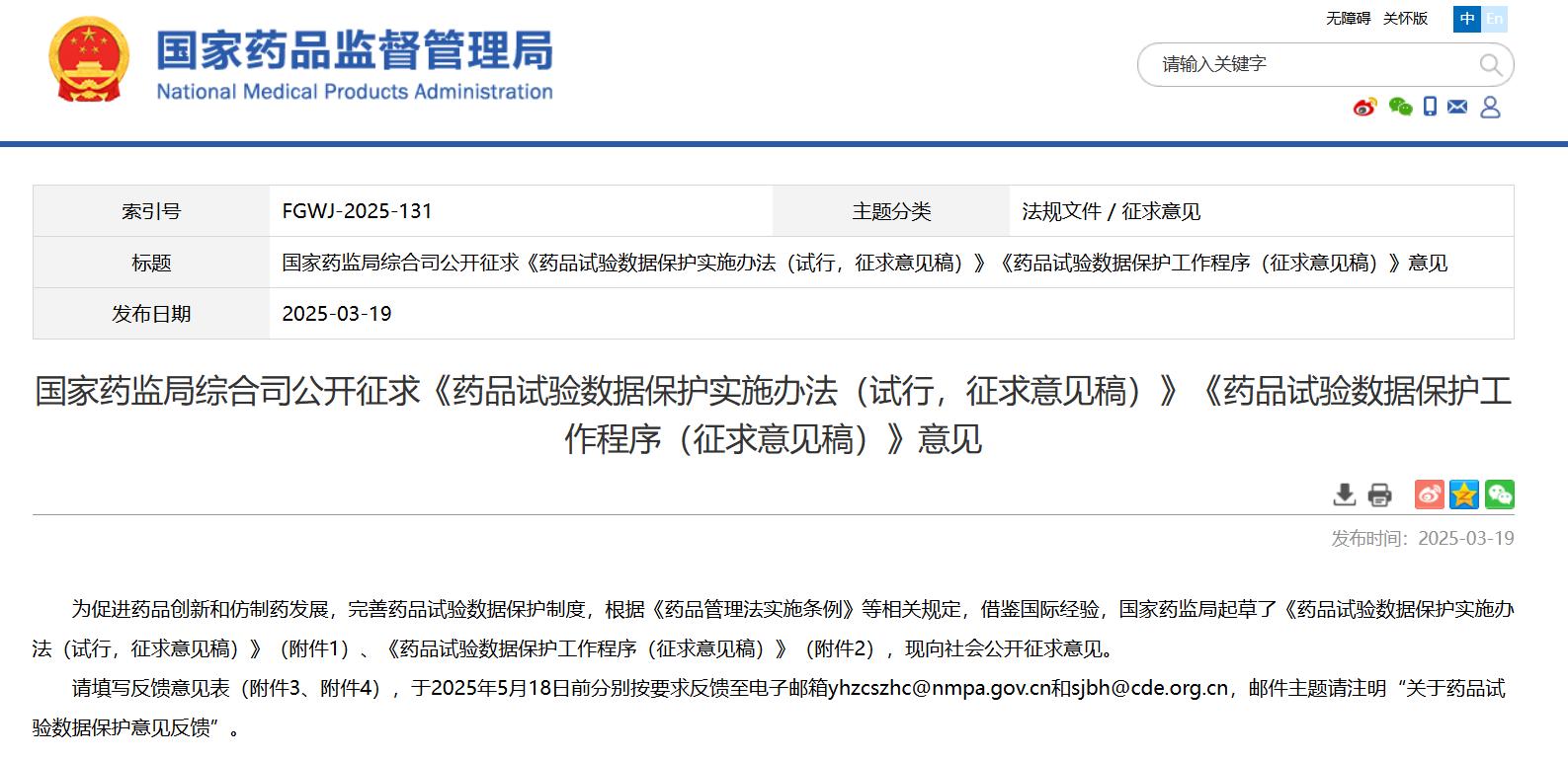 国家药监局综合司公开征求《药品试验数据保护实施办法(试行,征求意见稿)》《药品试验数据保护工作程序(征求意见稿)》意见