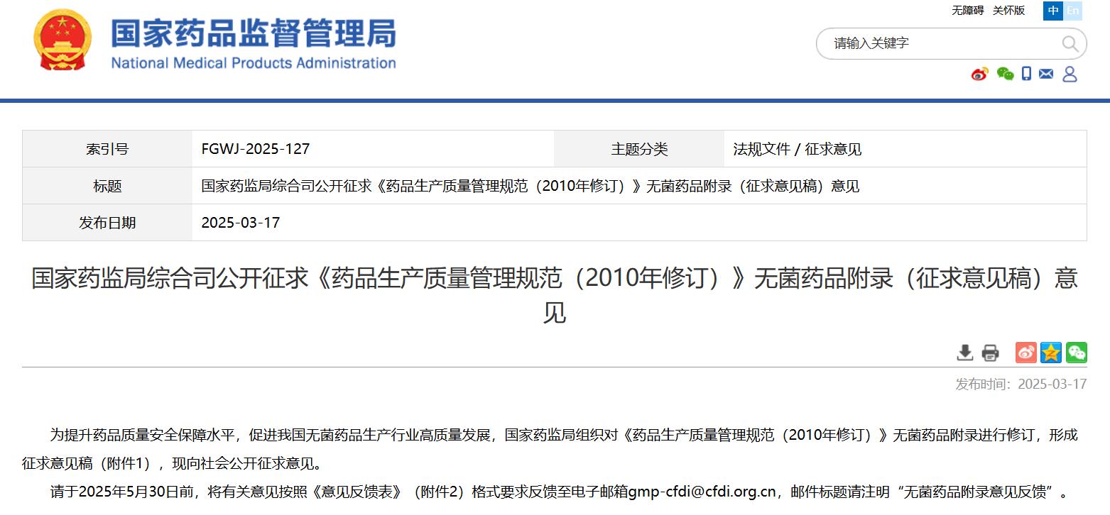 国家药监局综合司公开征求《药品生产质量管理规范(2010年修订)》无菌药品附录(征求意见稿)意见