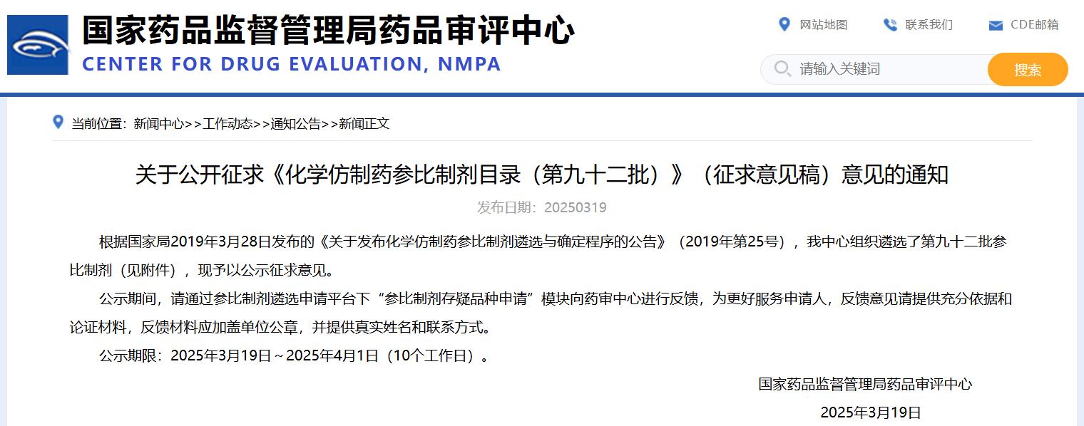 关于公开征求《化学仿制药参比制剂目录(第九十二批)》(征求意见稿)意见的通知
