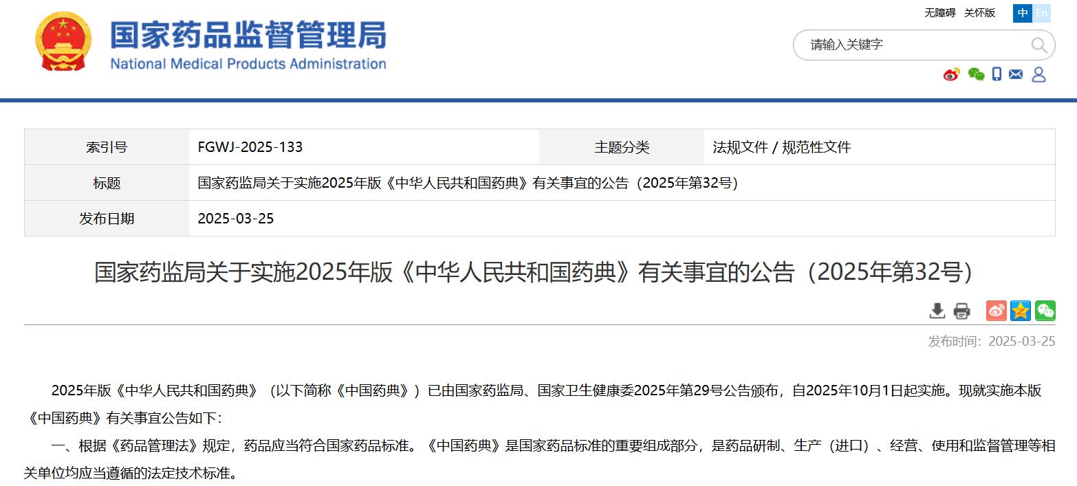 国家药监局关于实施2025年版《中华人民共和国药典》有关事宜的公告(2025年第32号)
