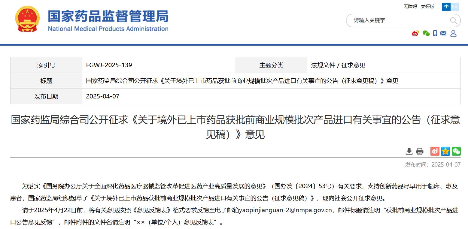国家药监局综合司公开征求《关于境外已上市药品获批前商业规模批次产品进口有关事宜的公告(征求意见稿)》意见