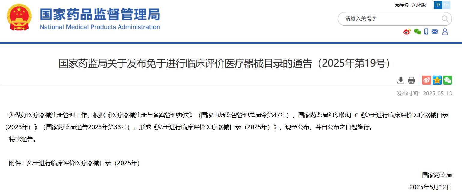 国家药监局关于发布免于进行临床评价医疗器械目录的通告(2025年第19号)