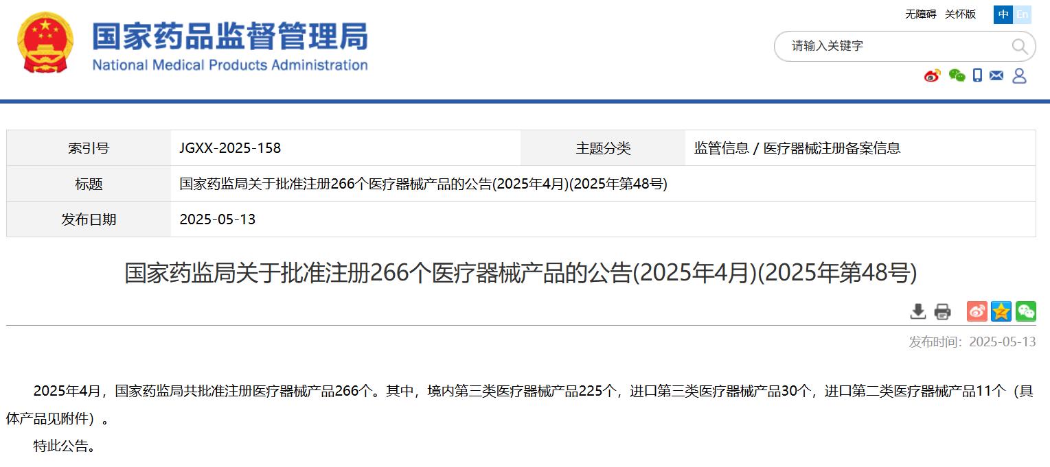 国家药监局关于批准注册266个医疗器械产品的公告(2025年4月)(2025年第48号)