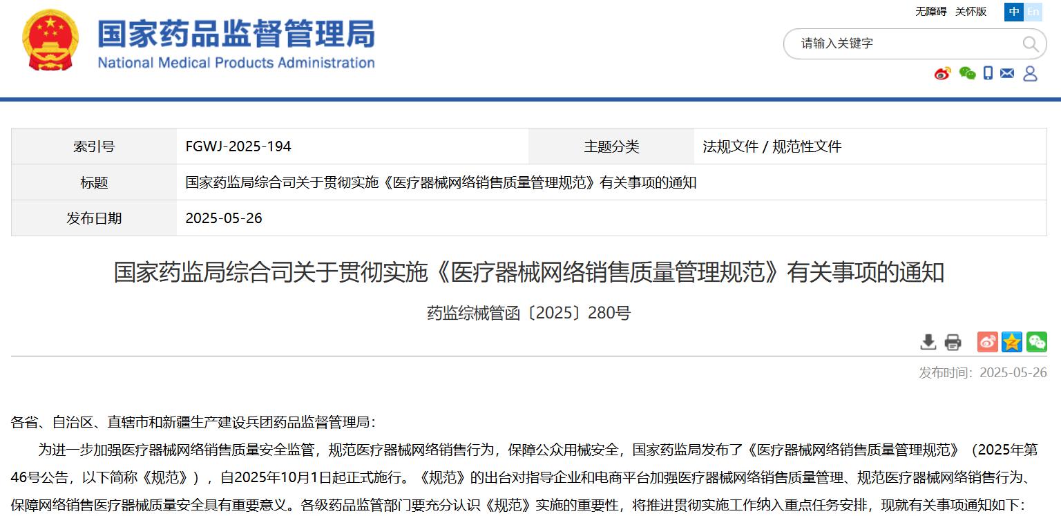 为进一步加强医疗器械网络销售质量安全监管,规范医疗器械网络销售行为,保障公众用械安全,国家药监局发布了《医疗器械网络销售质量管理规范》,自2025年10月1日起正式施行。