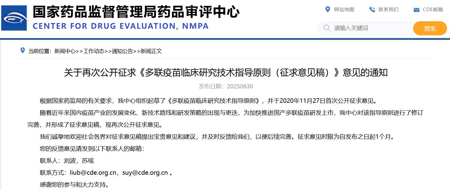 关于再次公开征求《多联疫苗临床研究技术指导原则(征求意见稿)》意见的通知