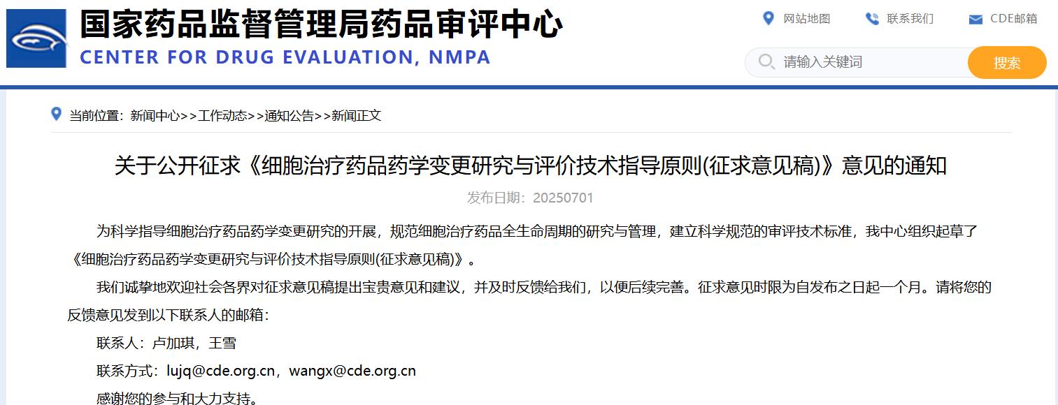 关于公开征求《细胞治疗药品药学变更研究与评价技术指导原则(征求意见稿)》意见的通知