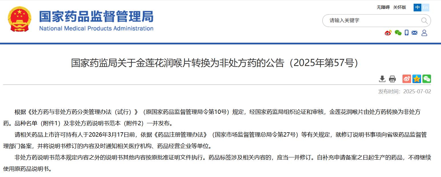 国家药监局关于金莲花润喉片转换为非处方药的公告(2025年第57号)