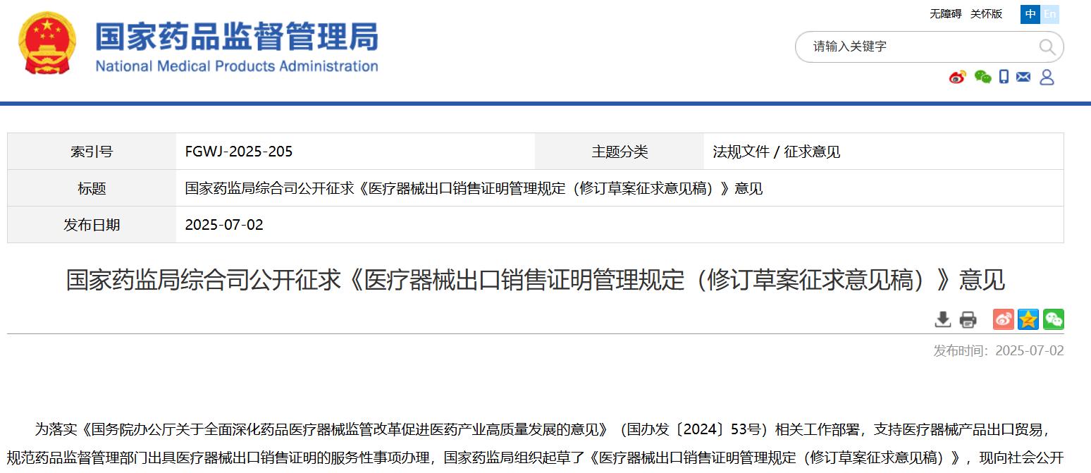 国家药监局综合司公开征求《医疗器械出口销售证明管理规定(修订草案征求意见稿)》意见