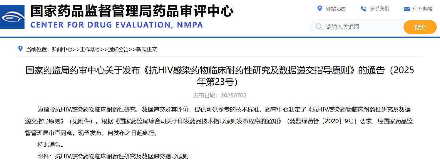 国家药监局药审中心关于发布《抗hiv感染药物临床耐药性研究及数据递交指导原则》的通告(2025年第23号)