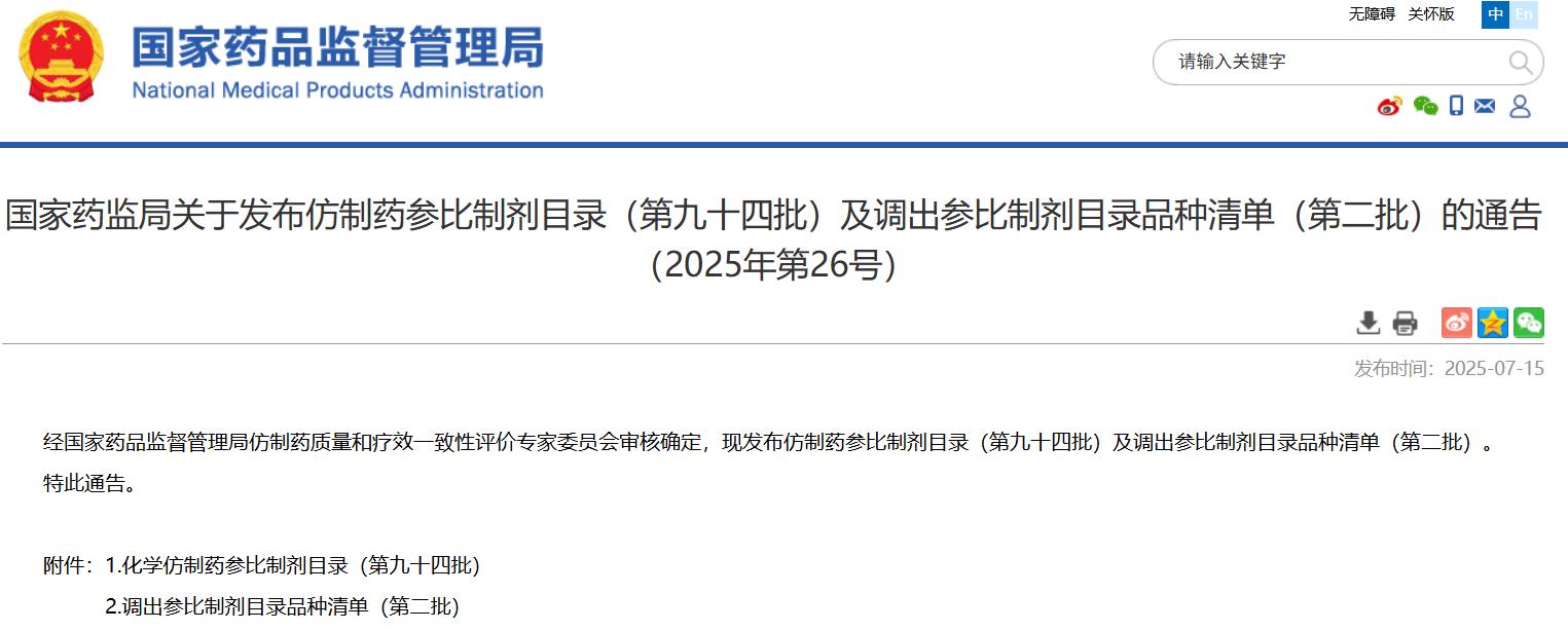 国家药监局关于发布仿制药参比制剂目录(第九十四批)及调出参比制剂目录品种清单(第二批)的通告(2025年第26号)