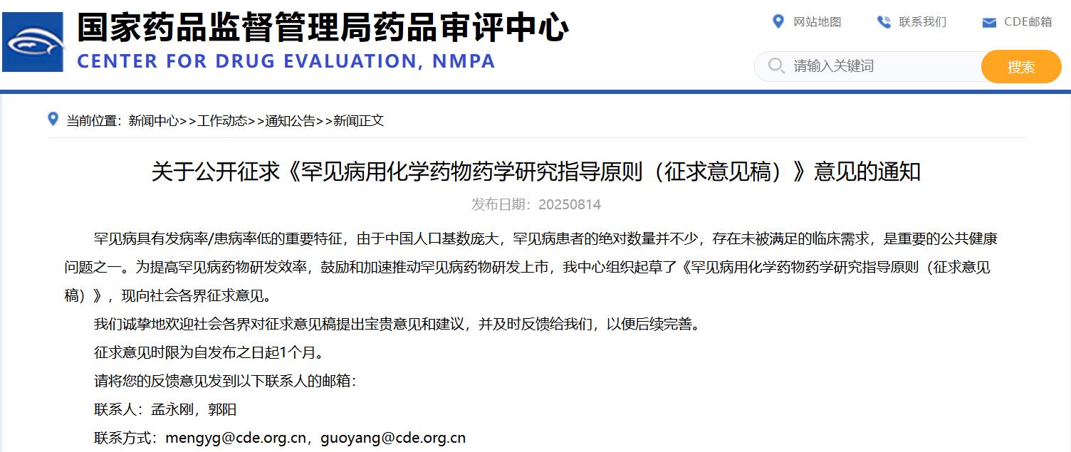 关于公开征求《罕见病用化学药物药学研究指导原则(征求意见稿)》意见的通知