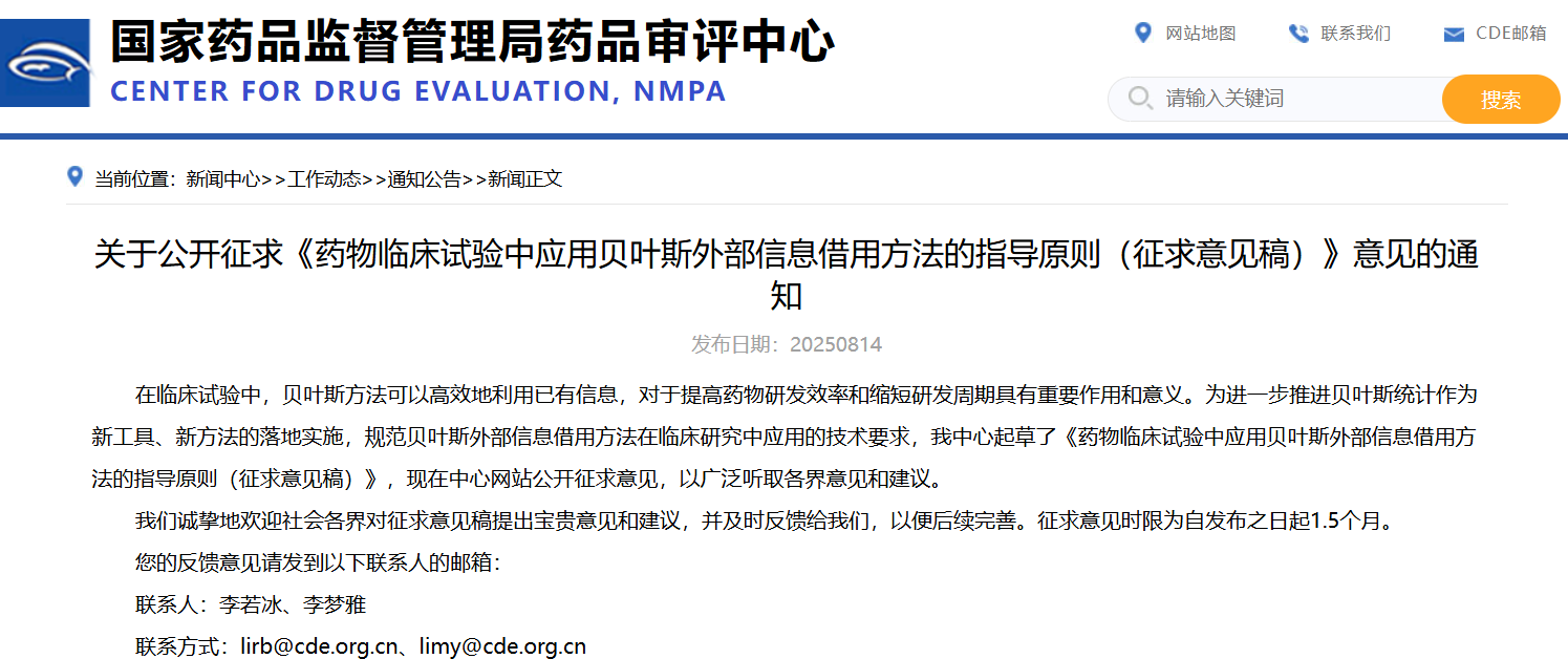 关于公开征求《药物临床试验中应用贝叶斯外部信息借用方法的指导原则(征求意见稿)》意见的通知