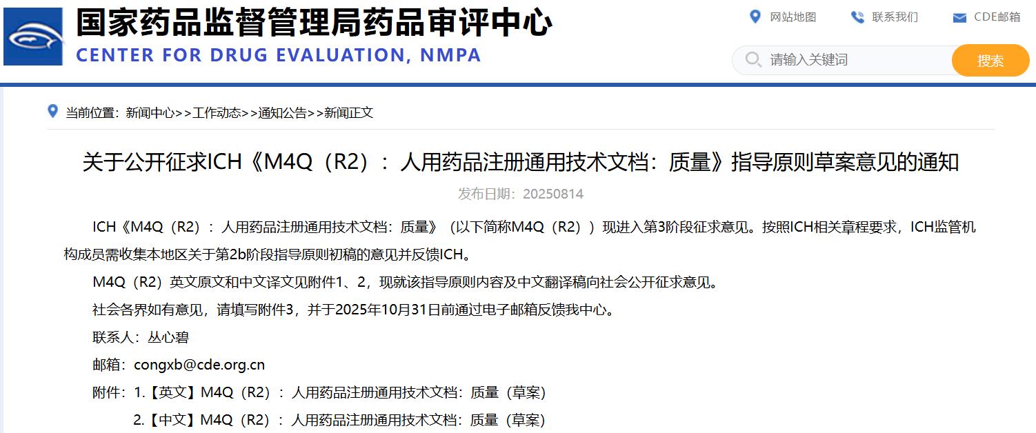 关于公开征求ich《m4q(r2):人用药品注册通用技术文档:质量》指导原则草案意见的通知